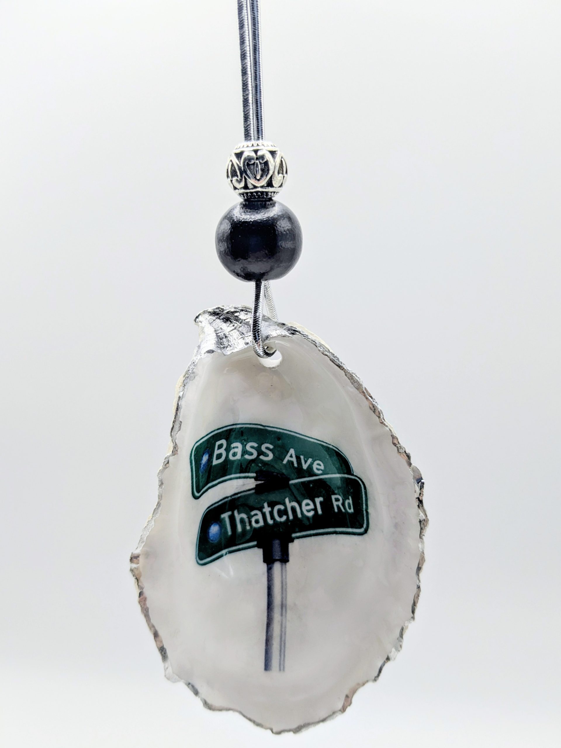 Bring a piece of Cape Ann’s coastal charm into your home with this beautifully handcrafted decorated oyster shell. Featuring the street signs “Bass Ave” and “Thatcher Rd”—the beloved route that leads straight to Good Harbor Beach—this unique piece blends nautical nostalgia with artisan craftsmanship.