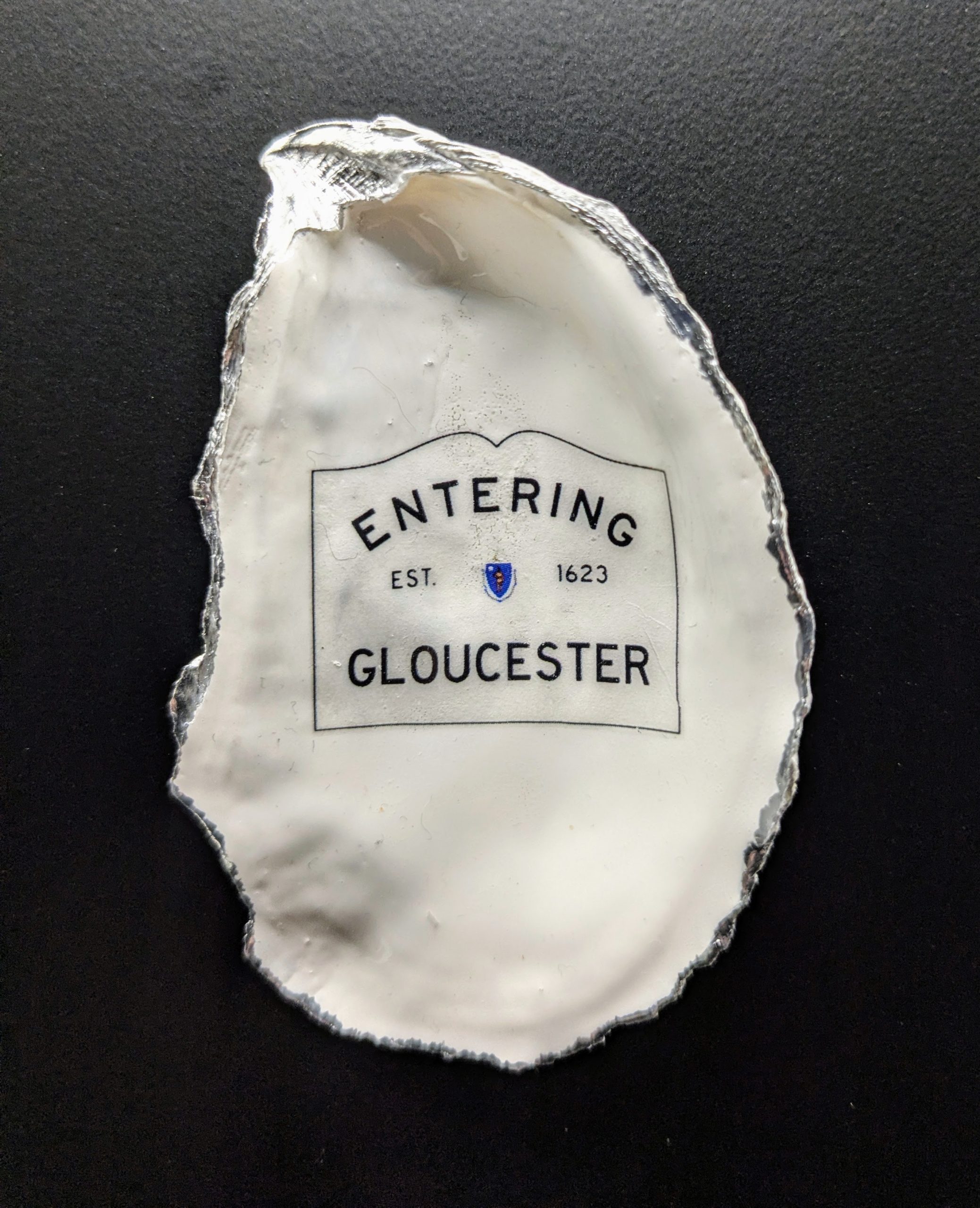 Celebrate the spirit of New England’s working waterfront with this handcrafted decoupaged oyster shell magnet, featuring the iconic Entering Gloucester sign. Finished with delicate silver-painted trim, the shell’s natural texture and coastal patina are beautifully framed, creating a timeless keepsake rooted in seaside tradition.